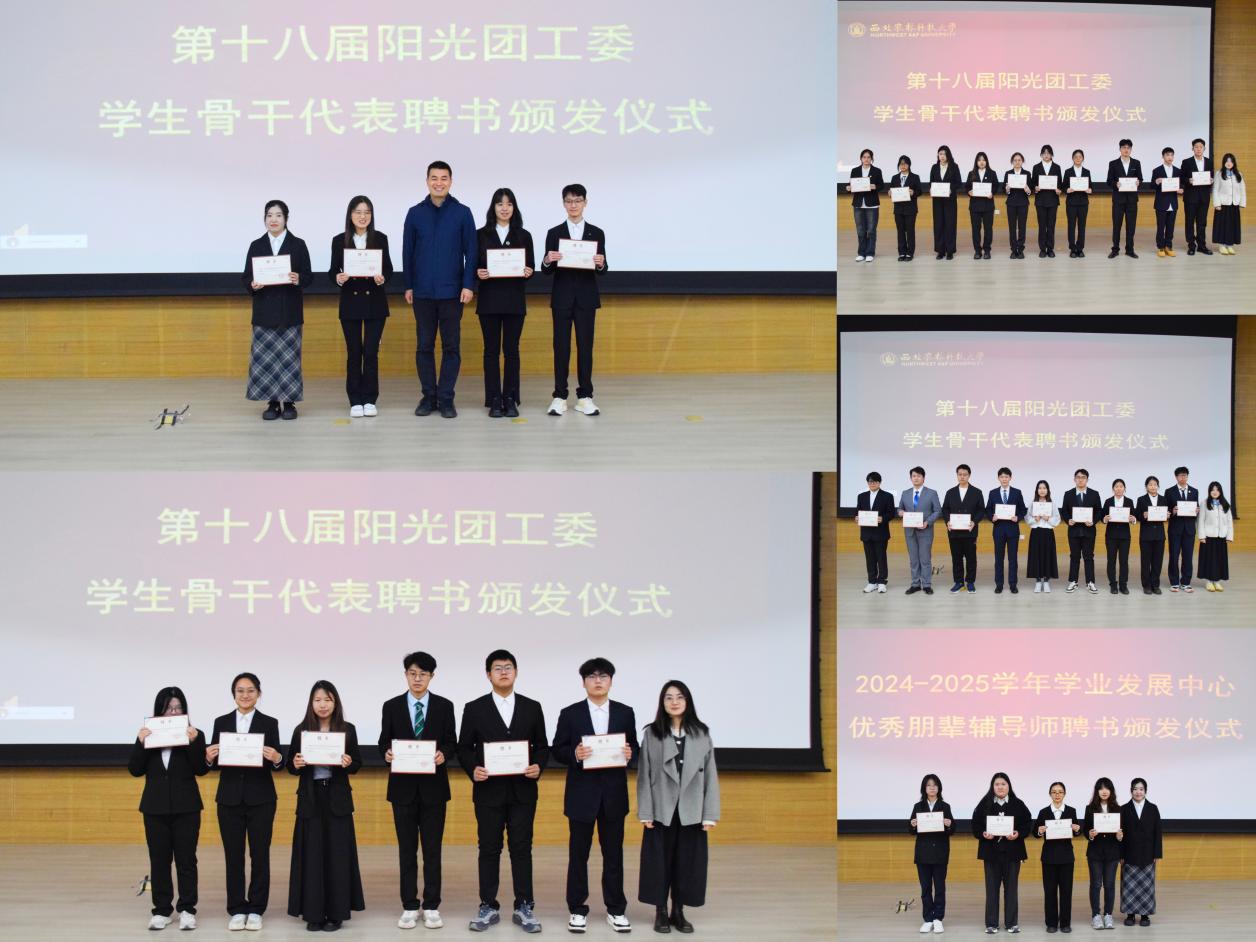 鉴于部分团员在过去一年工作中的优异表现,各位指导老师为第十八届阳光团工委学生骨干代表及优秀朋辈辅导师颁发聘书并合影留念。虽然经验丰富的前辈将要离职,但阳团仍有生生不息的后辈力量接下前进的接力棒。在众人的期盼中,第十九届阳光团工委学生骨干代表黄奕翔与龙玉龄同学进行就职演讲,两人对未来工作做出清晰规划。演讲结束后,第一副书记李萌带领第十九届阳光团工委学生骨干庄严宣誓:在今后履行学生骨干义务,为阳团无私奉献。